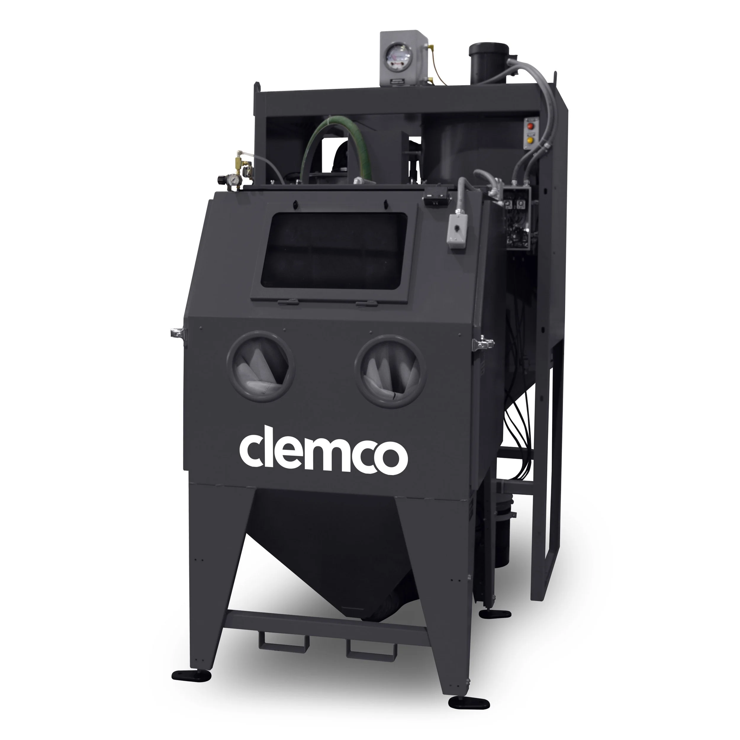 An enclosed cabinet with media reclaim and dust collection systems to ensure consistent blast quality and cleanliness